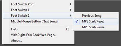 Audio file playback can be controlled by a footswitch connected to a COM port. There are 2 modes available from the Options menu; Start/Pause and Start/Reset. Start/Pause will start playback on the first press of the foot switch and then pause/resume on subsequent presses. Start/Reset will start playback on the first press of the footswitch and stop and reset back to the beginning on the next press.